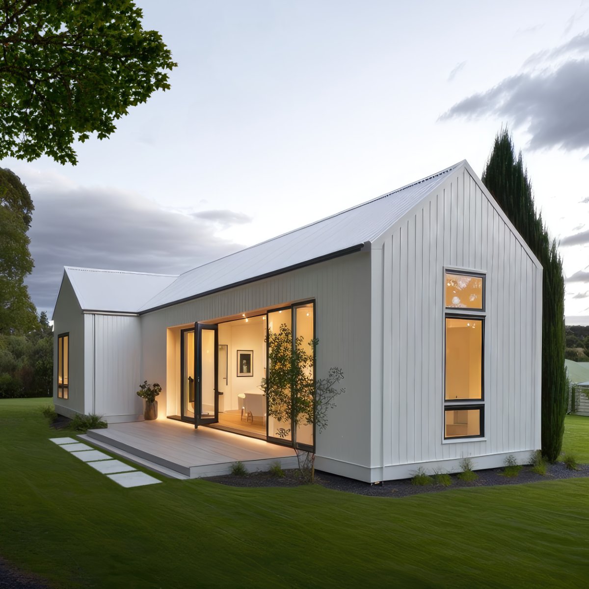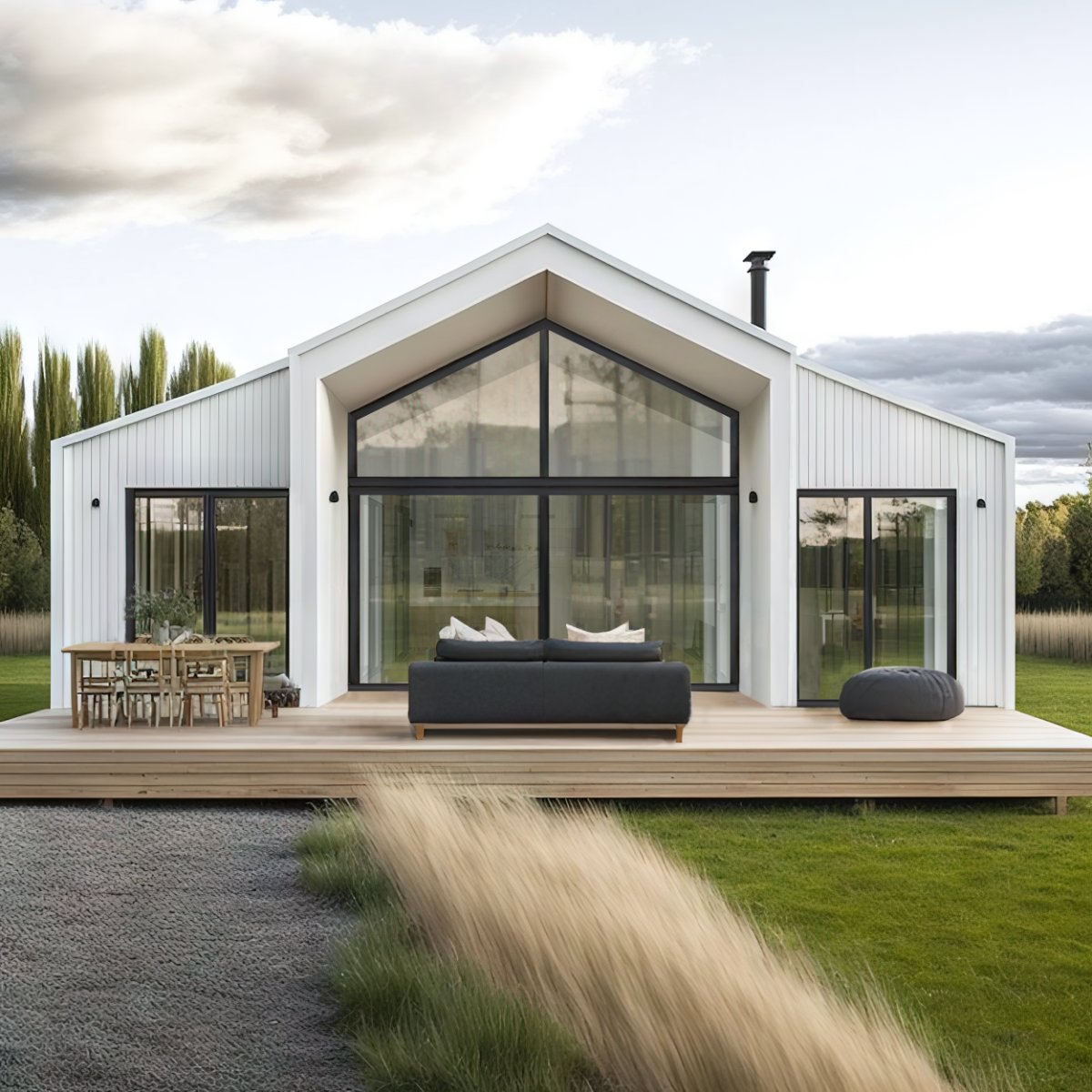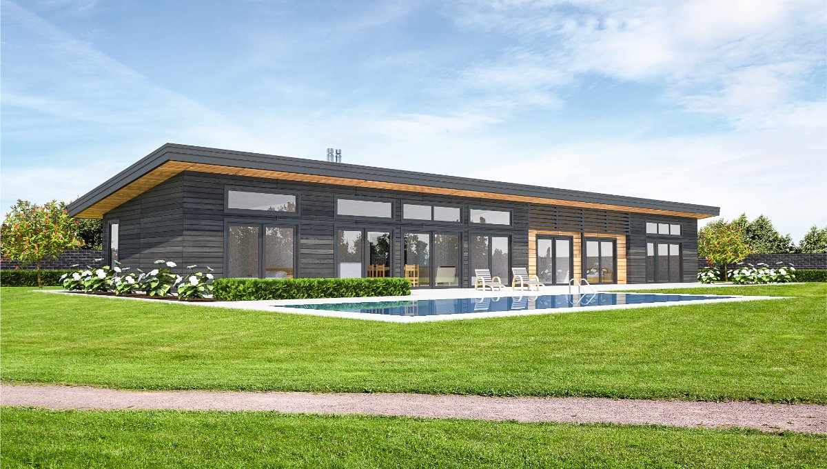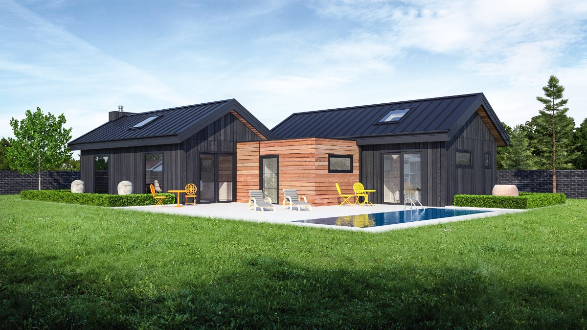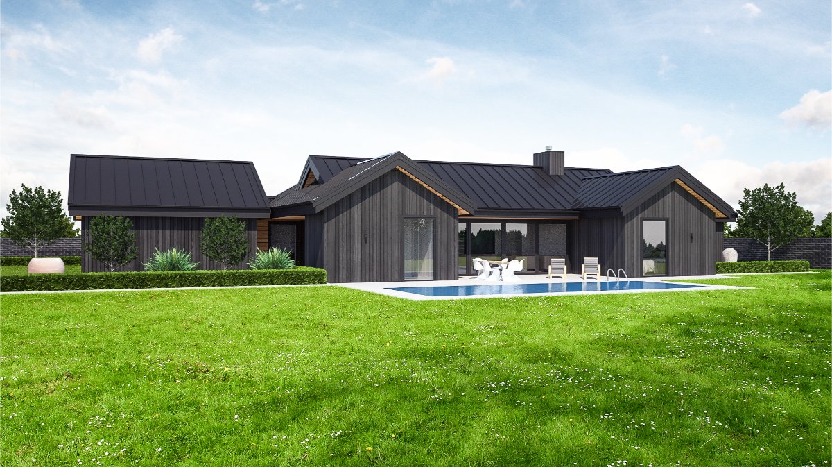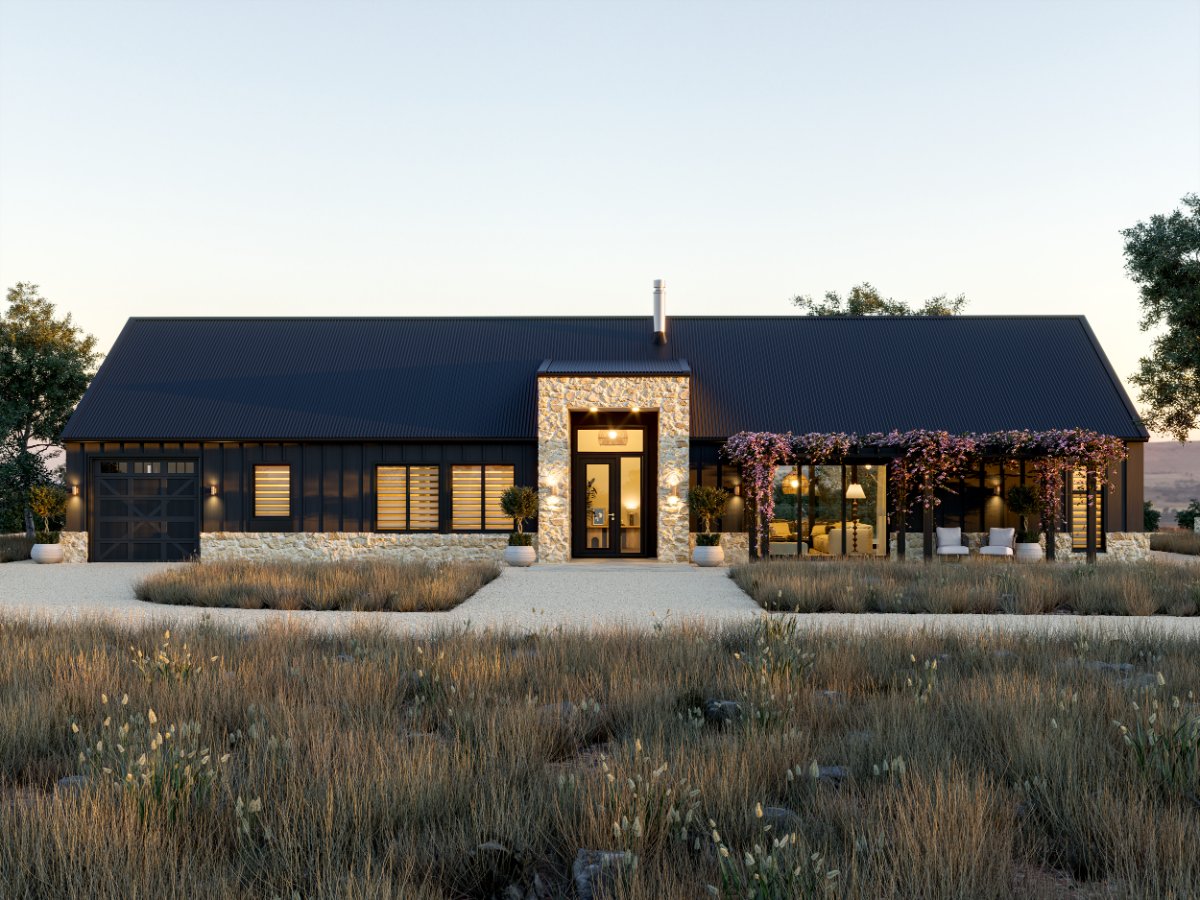 Step into a home where countryside charm and modern living unite effortlessly. The single-gable roofline lends a timeless silhouette, framed by metal cladding, reclaimed brick, and subtle board-and-batten accents. Inside, the main bedroom provides a peaceful retreat, while the open-plan design centres around a cosy fireplace, flowing into the dining area and a kitchen with a butler’s pantry. A glazed outdoor space draws in natural light, and the roof offers the perfect spot for solar panels, embracing self-sufficient living year-round. Just like the feeling of ‘home,’ this design is built to last.