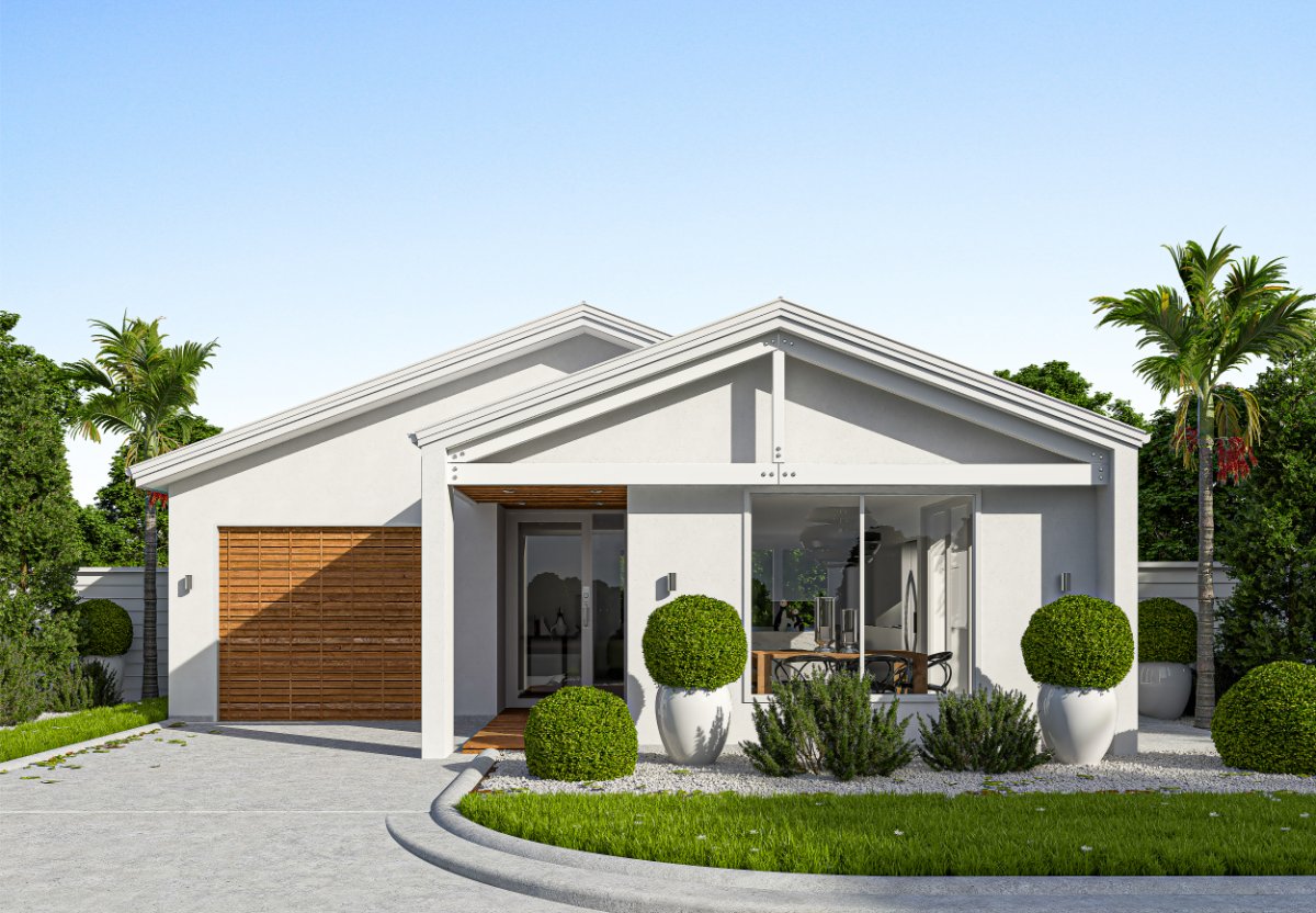 This twin-gable home has a small footprint without compromising on features. Inside the dining connects to its own outdoor space. The kitchen and living are both positioned in an open plan layout. The master has an extensive side-by-side wardrobe, and it’s own ensuite. The laundry resides in the garage, and both bedrooms and the living room can easily access the bathroom. If you want a cost-effective three-bedroom home that doesn’t look boring, this is it!