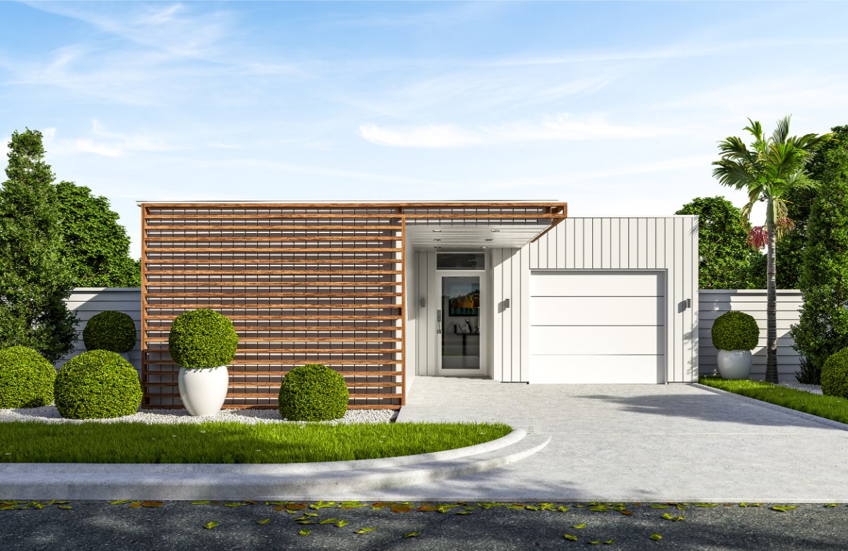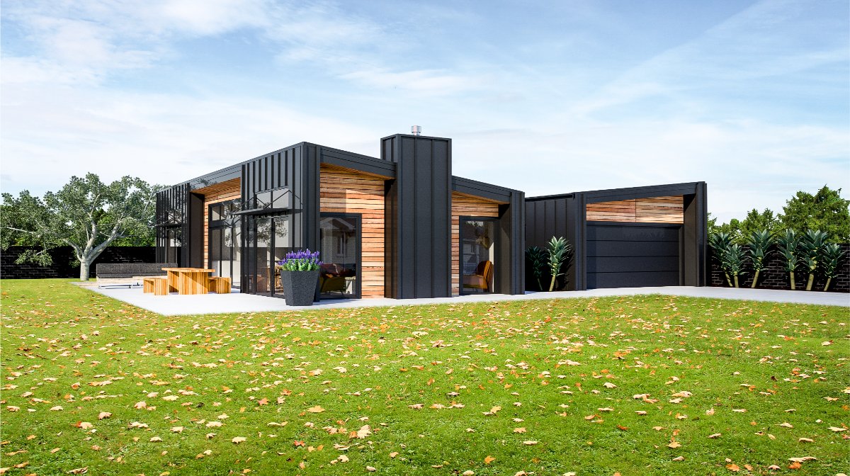 The Caistor is designed as a compact home with a small footprint and narrow in width. The home includes everything one needs in a modern home and can be suited to a large number of sections. The change in exterior shapes allows for two cladding types to be used and look great while doing so. The hallway of this home can also be extended to add another room or brought in to make it a two bedroom home. Your money is well spent on a cost effective, yet architectural home with this new home design.